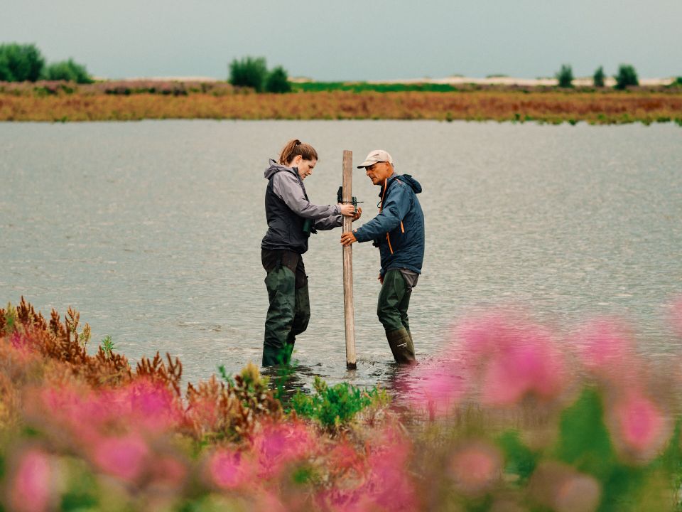Jan and Camilla, affiliated with the Lowland Ecology Network, study not one, but several areas within the National Park. To obtain specific information, they chose three ‘indicator’ bird species: the common tern, the spoonbill and the pied avocet. Jan: "The common tern gives us insight into the use of breeding and feeding areas on open water, such as the IJsselmeer. They catch fish on the open water and by studying where they do this, we can assess how productive this ecosystem is and whether there is enough fish. The avocet gives us information about Marker Wadden as a breeding and feeding area. These birds, including their chicks, search for small invertebrates in the mudflats and shallow water and give us insight into the quality of the area. Spoonbills commute between different areas, breeding in one place and then using other areas to catch fish in shallow water. These three species together give us a good overview of the use of the different areas and landscape types in National Park Nieuw Land.”