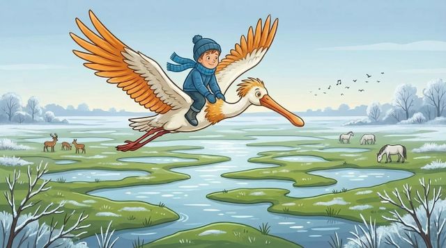 Naast hem stapte IJsbrand sierlijk door het ondiepe water. Zijn lange poten maakten geen geluid, alsof hij zelf een schaduw was. “Vandaag,” zei IJsbrand, terwijl hij zijn vleugels even strekte, “gaan we op