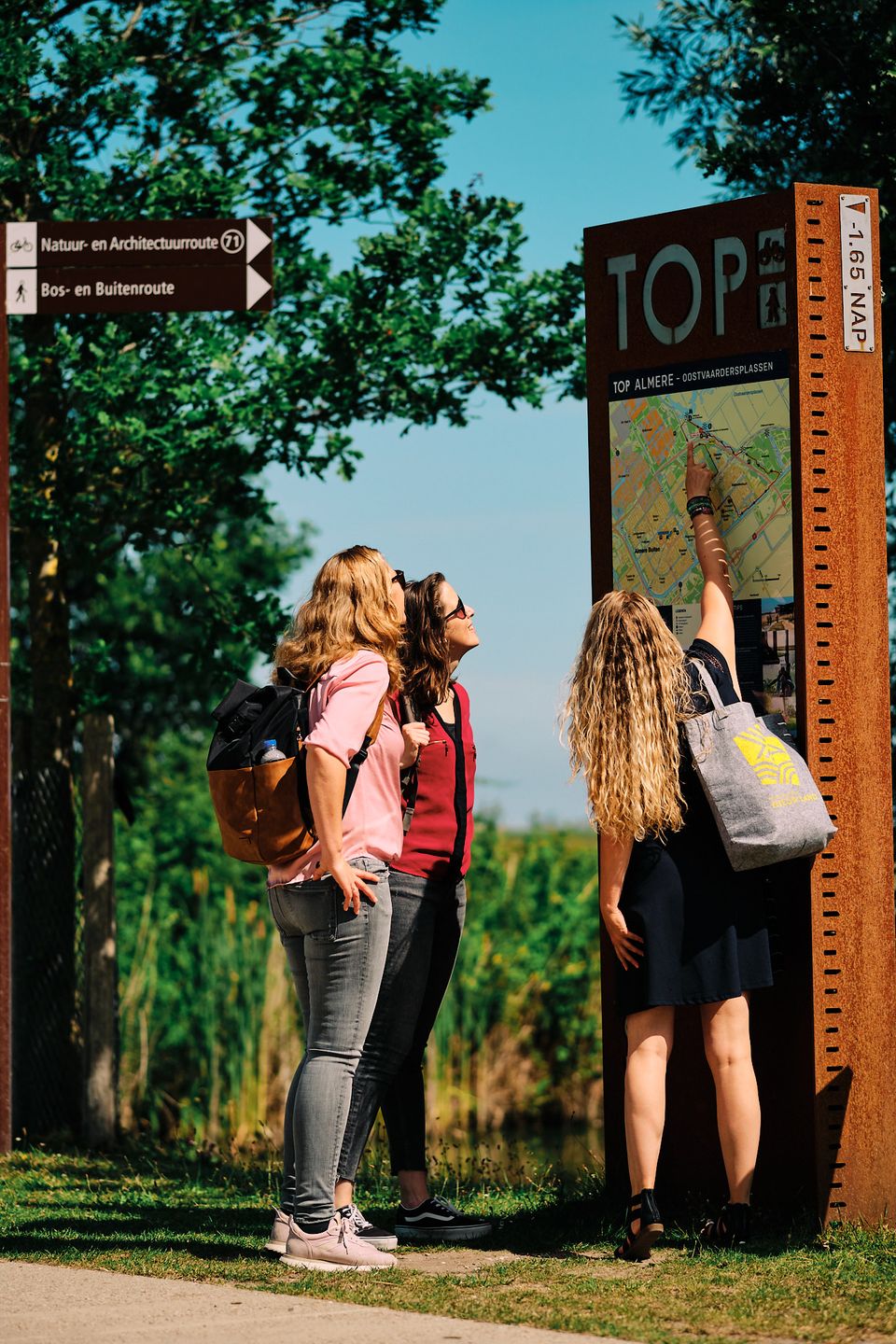 Speciaal voor wandelaars en fietsers staat er een aantal Toeristische Overstappunten (TOP's) in Nationaal Park Nieuw Land. Een TOP is het ideale startpunt van je wandeling of fietstocht, waar je jouw auto gratis kunt parkeren. Ook is er een restaurant in de buurt. Bij iedere TOP starten verschillende (bewegwijzerde) wandel- en fietsroutes. Zo ontdek je heel gemakkelijk de mooiste routes door Nationaal Park Nieuw Land. De TOP’s zijn herkenbaar aan de cortenstalen infozuil van bijna 3 meter hoogte en die in Nationaal Park Nieuw Land staan aan de Lelystadse kant van de Oostvaardersplassen en aan de Almeerse kant van de Oostvaardersplassen.