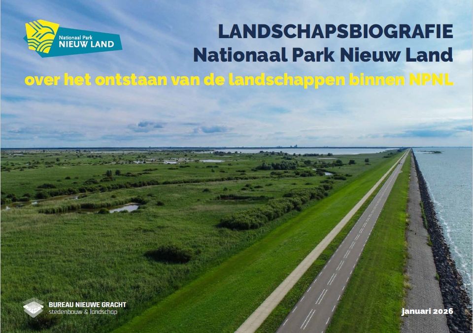 In de Landschapsbiografie Nationaal Park Nieuw Land wordt het ontstaan van het landschap in en rond het nationaal park beschreven en verbeeld. Dat gebeurt door de veranderingen van het landschap door de eeuwen heen te beschrijven. Het accent ligt daarbij op de betekenis van die veranderingen voor de huidige natuurwaarden binnen het nationaal park. De biografie beantwoordt bijvoorbeeld de vraag waarom de verschillende deelgebieden binnen Nationaal Park Nieuw Land eruit zien zoals ze eruit zien. Maar ook de vragen waarom ze liggen waar ze liggen en welke basis dat biedt voor de huidige natuurwaarden komen aan bod.