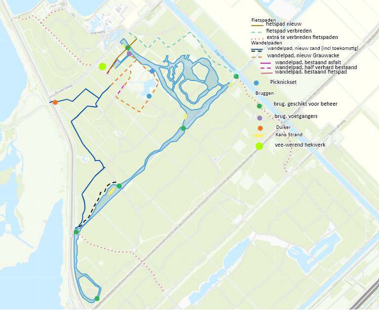 Vanaf de nieuwe parkeerplaats (maximaal 300 parkeerplekken) kunnen bezoekers wandelen, paardrijden, fietsen of overstappen op een kano of ander vervoer middel om op die manier het Nationaal Park Nieuw Land te gaan verkennen. Er starten verschillende recreatieve routes en er worden nieuwe routes uitgezet, dit volgt na de aanleg van de nieuwe slenk (waterpartij). In het ontvangstgebied is ruimte voor 1 of meerdere Poortgebouw(en) voor ontvangst, infoverstrekking en kunnen faciliteiten komen, zoals horeca en verhuur.