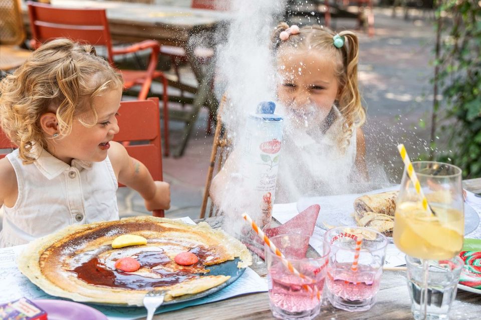 Het pannenkoekenhuis Bij Hans & Grietje kom je oren en ogen tekort. Tafels bewegen, vloer…