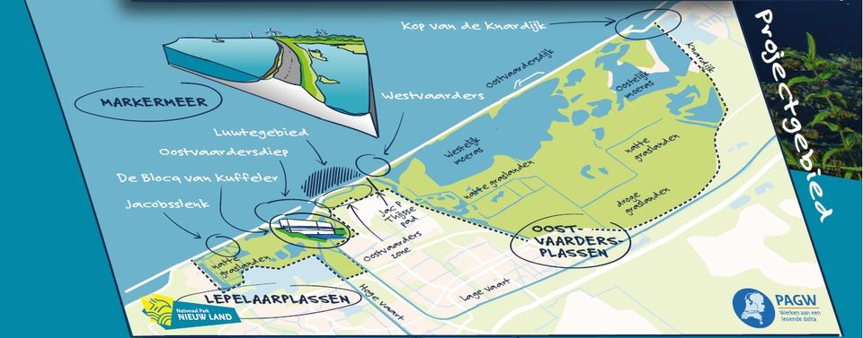Project Oostvaardersoevers focust op de deelgebieden Markermeer, Oostvaardersplassen en Lepelaarplassen. In het Markermeer zijn de scheidingen onder water tussen deze gebieden hard, door het ontbreken van natuurlijke zachte land-waterovergangen. Dit is te zien in de doorsnede van het Markermeer links bovenin de plaat. Project Oostvaardersoevers wil deze gebieden met elkaar verbinden. Hiervoor worden verschillende maatregelen genomen de te zien zijn op de volgende plaat ‘water en vis’.