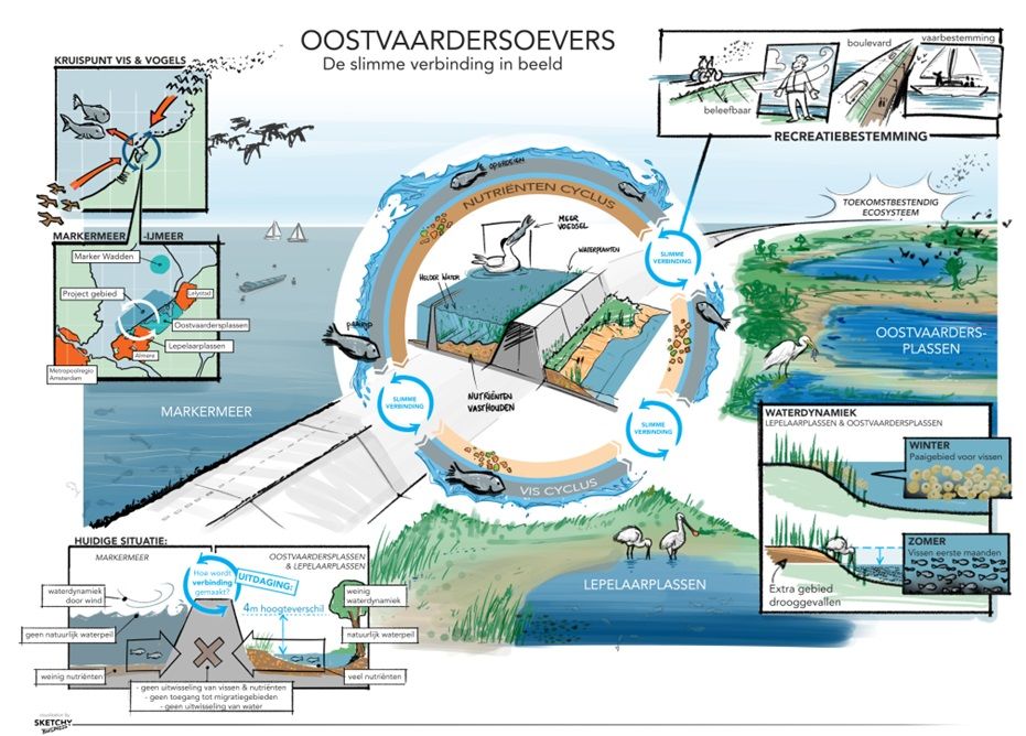 Het Markermeer, de Oostvaardersplassen en de Lepelaarplassen zijn 3 bijzondere natuurgebieden in het hart van Nederland. Onder water zijn het kruispunten van belangrijke trekroutes voor vissen zoals de paling. Het is de kraamkamer en de voedselschuur voor snoeken en spierinkjes. Op en boven het water is het rust en foerageergebied van vele vogels zoals voor de zwarte stern en de zeearend. Mooie, maar kwetsbare natuurgebieden. De natuur kan worden versterkt door een verbinding met een grootschalige, geleidelijke overgang van diep water naar ondiep plas-dras-oeverland. Zo ontstaat meer dynamiek, diversiteit en een groter aaneengesloten leefgebied.